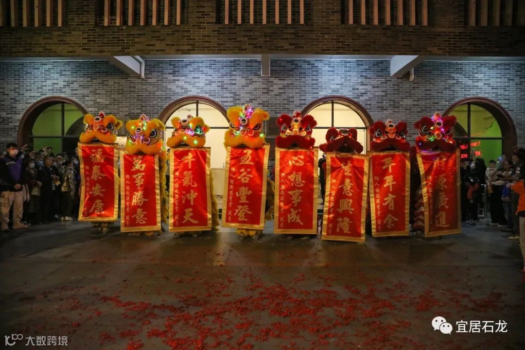 “锣鼓一响,黄金万两,瑞狮起舞,阖家幸福。”