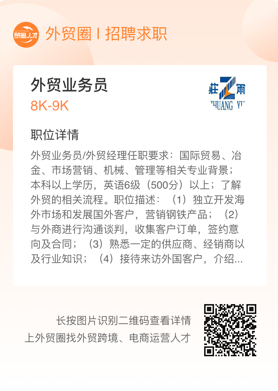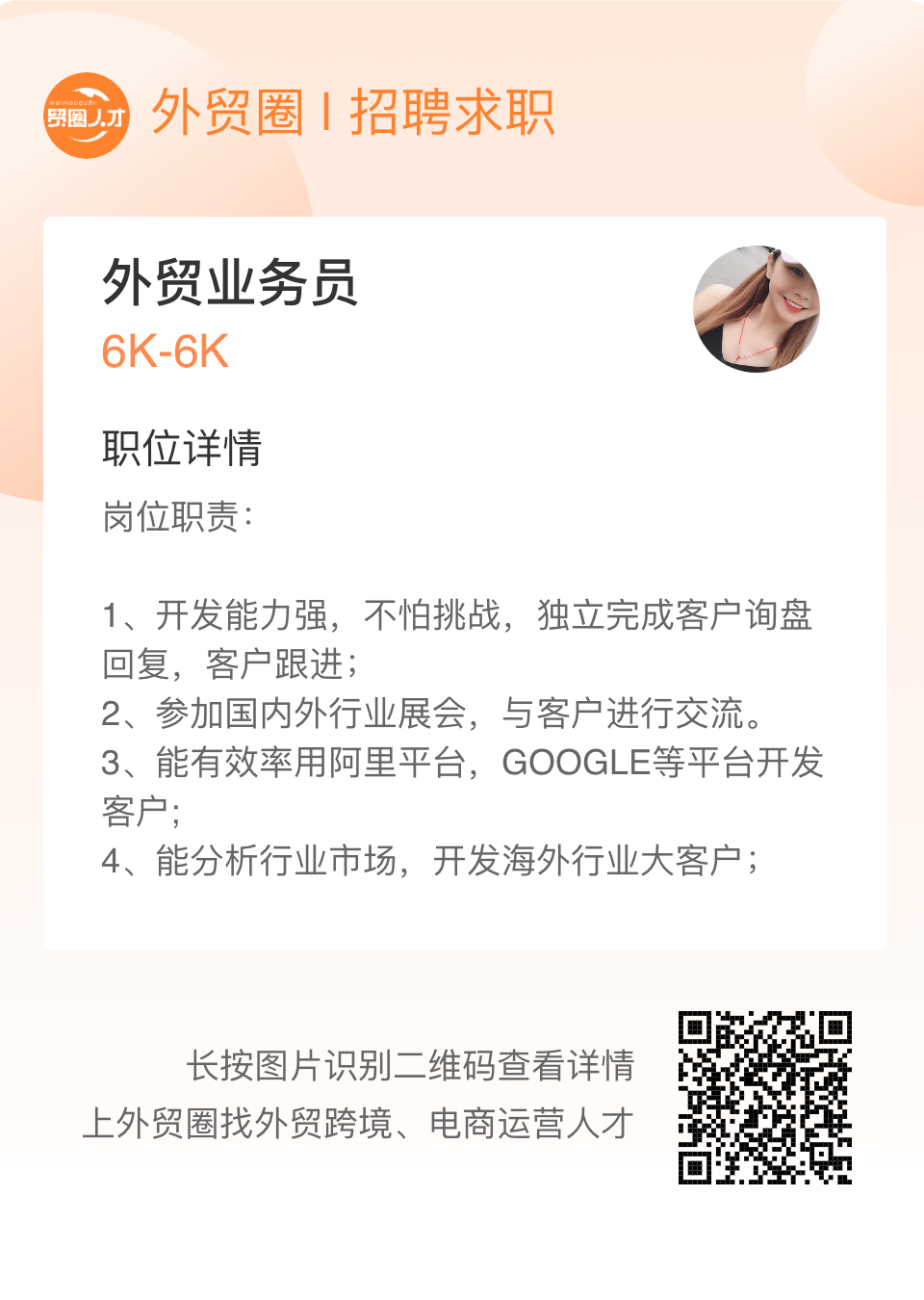 扫码加入社群后联系群主在外贸圈招聘求职平台发布信息!