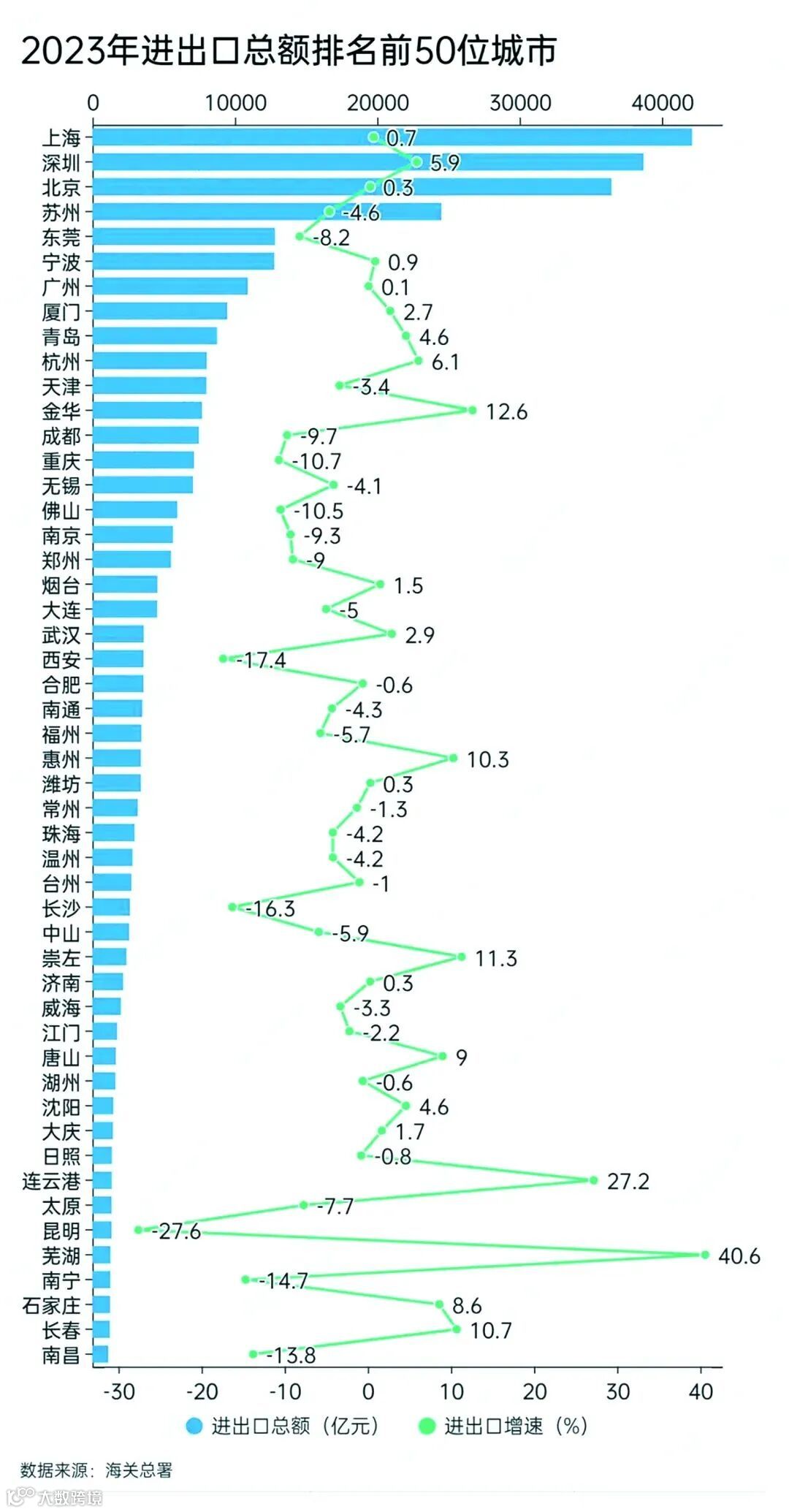 ● 杭州的货物进出口总值达到了7323亿元,同比增长了4.7%。其中,出口额达到了4868亿元,增长了2.3%,这个数字甚至超过了整个安徽省。