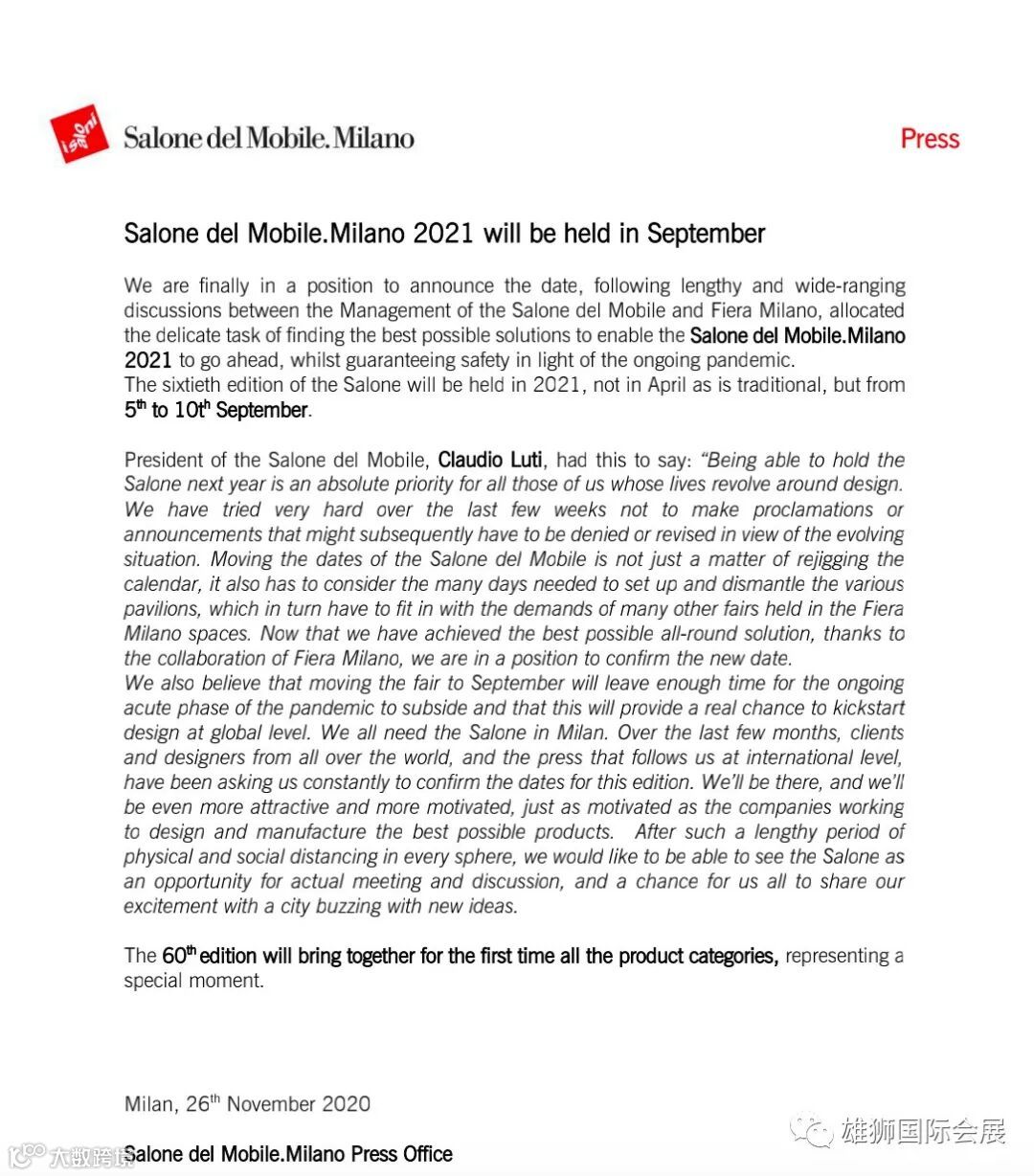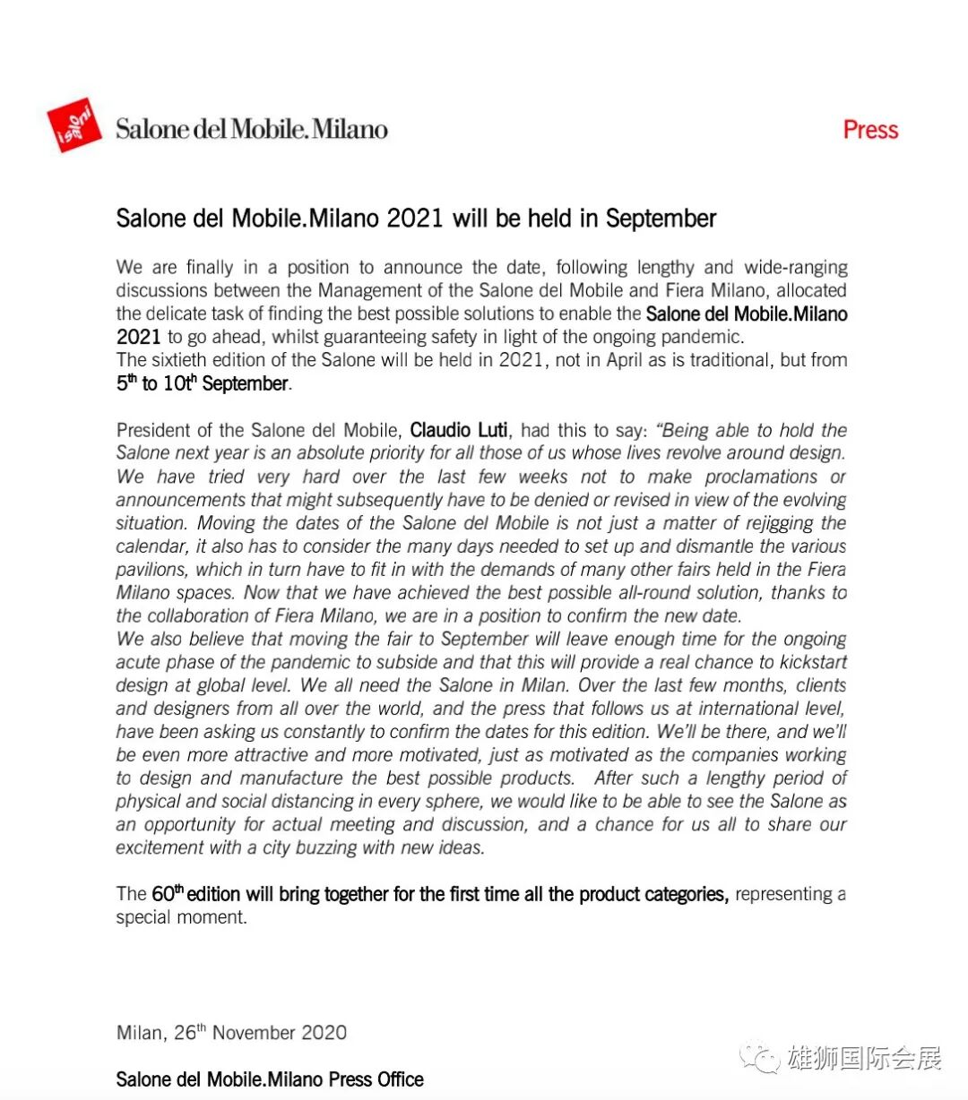 米兰展组委会发出了关于4月米兰国际家具设计展的通告,