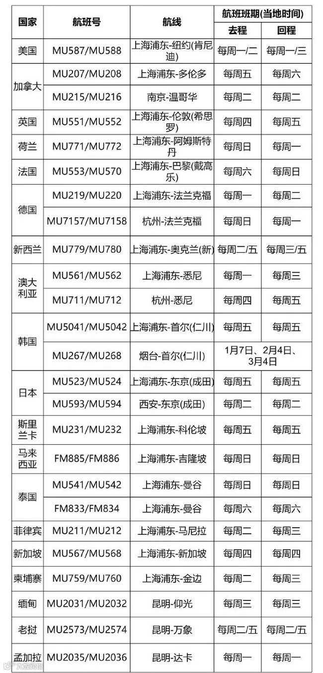 东航发布2021年1月1日至3月27日国际航班计划通告,每周可执飞25条国际航线,其中上海航线17条,昆明航线3条,南京航线1条,杭州航线2条,西安航线1条,烟台航线1条。其中,杭州飞法兰克福航线需要看机场保障能力和境外落地批复情况执行。具体航线计划如下: