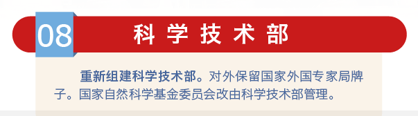 将科学技术部、国家外国专家局的职责整合,重新组建科学技术部,作为国务院组成部门。科学技术部对外保留国家外国专家局牌子。