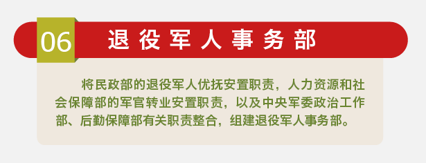 将民政部的退役军人优抚安置职责,人力资源和社会保障部的军官转业安置职责,以及中央军委政治工作部、后勤保障部有关职责整合,组建退役军人事务部,作为国务院组成部门。
