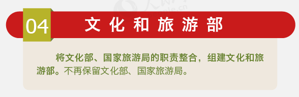 将文化部、国家旅游局的职责整合,组建文化和旅游部,作为国务院组成部门。不再保留文化部、国家旅游局。