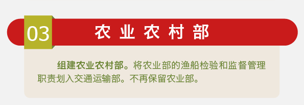 将农业部的职责,以及国家发展和改革委员会的农业投资项目、财政部的农业综合开发项目、国土资源部的农田整治项目、水利部的农田水利建设项目等管理职责整合,组建农业农村部,作为国务院组成部门。
