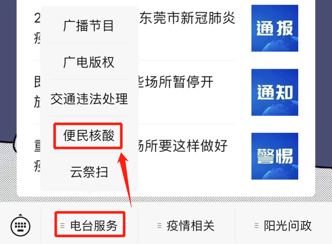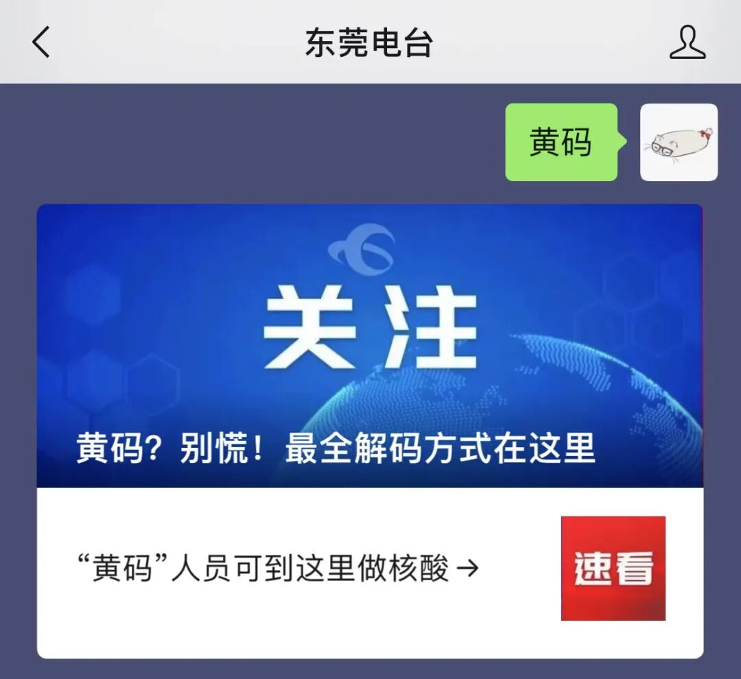 此外,具备黄码检测通道的采样点名单也可在“东莞电台”微信公众号底部菜单的“电台服务”-“便民核酸”中查询。(注:黄码专区是免费检测的。)
