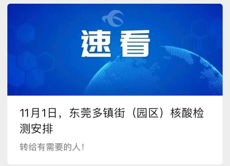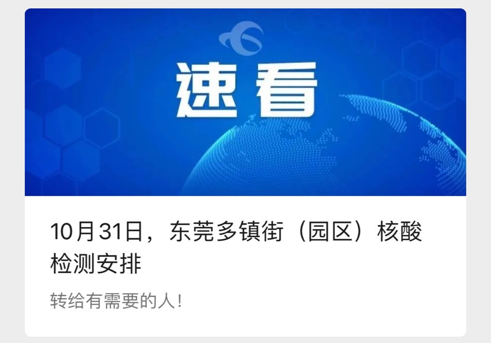 截至发稿,东莞这些镇街已发布核酸检测相关通知:望牛墩、常平、长安、横沥、茶山、道滘、莞城、东城、石龙、凤岗、谢岗、石排、黄江、樟木头、沙田、大岭山、东坑、万江、清溪、洪梅、麻涌、塘厦、南城、石碣、高埗、厚街、桥头、寮步、大朗…(各镇街最新安排,小编会及时跟进与更新,请密切留意。)