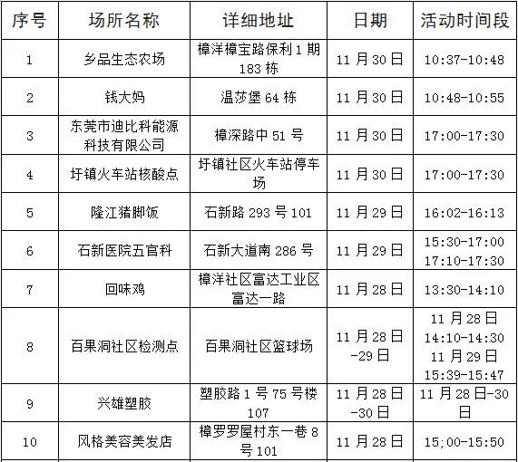 (二)其乐市场街18号美宜佳商店、其乐市场街四巷8号四川麻辣烫小店、其乐市场中路7号东莞国药药店、其乐市场中路8号柳州螺蛳粉小店,12月3日00:30—00:45。