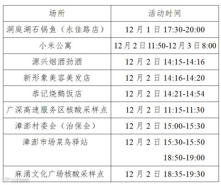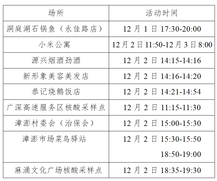 12月2日,我镇发现新冠肺炎核酸初筛异常人员,请到过以下场所的市民立即向所在村(社区)报备并就近前往附近核酸检测采样点进行核酸检测。