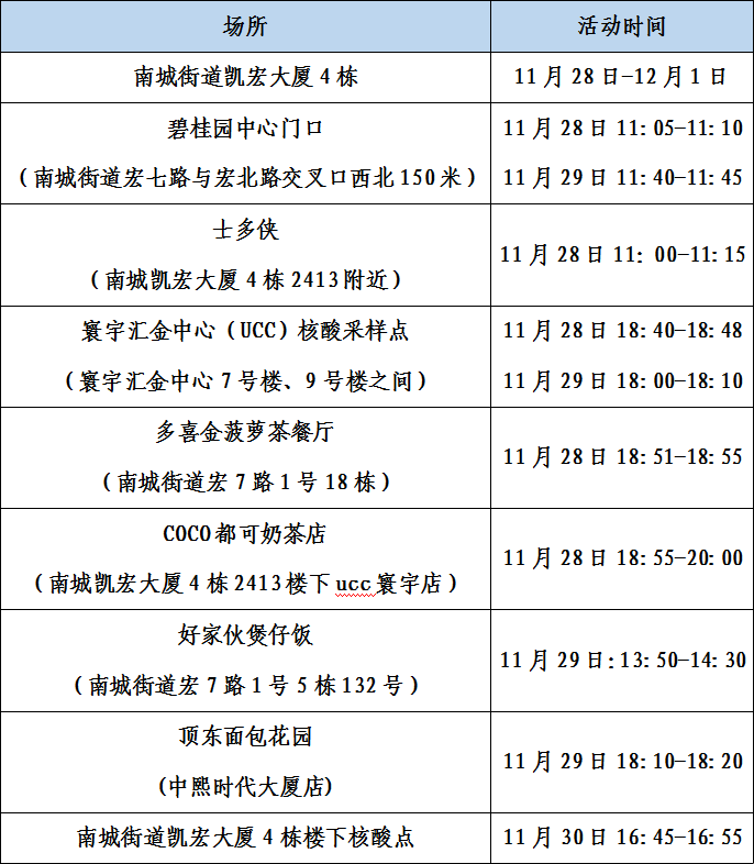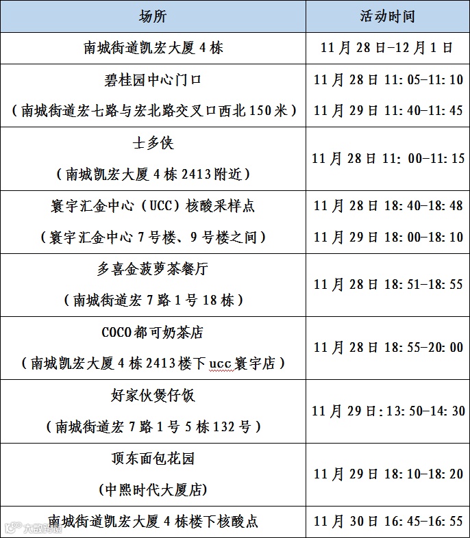 (十)长龙广场便民采样点,11月28日14:05-14:30、11月29日19:10-19:35。