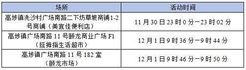 11月30日,东坑镇发现1例核酸检测阳性个案。为防止疫情进一步扩散,请在以下提及的时间段到过相关场所的人员,立即向所在村(社区)报备,并前往就近的核酸检测点进行核酸检测,同时配合村(社区)和疾控部门要求做好健康管理。