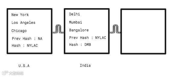 由于技术上哈希值的产生比较复杂,简便起见我们用城市名首字母来代替正轨的哈希值比如USA的那个方块里面有New York,LosAngeles和 Chicago三个城市,那么哈希值就是“NYLAC”,每个连续的区块链都包含上一个区块的哈希值,暂把它们称作“前哈希值”(Prev Hash)。