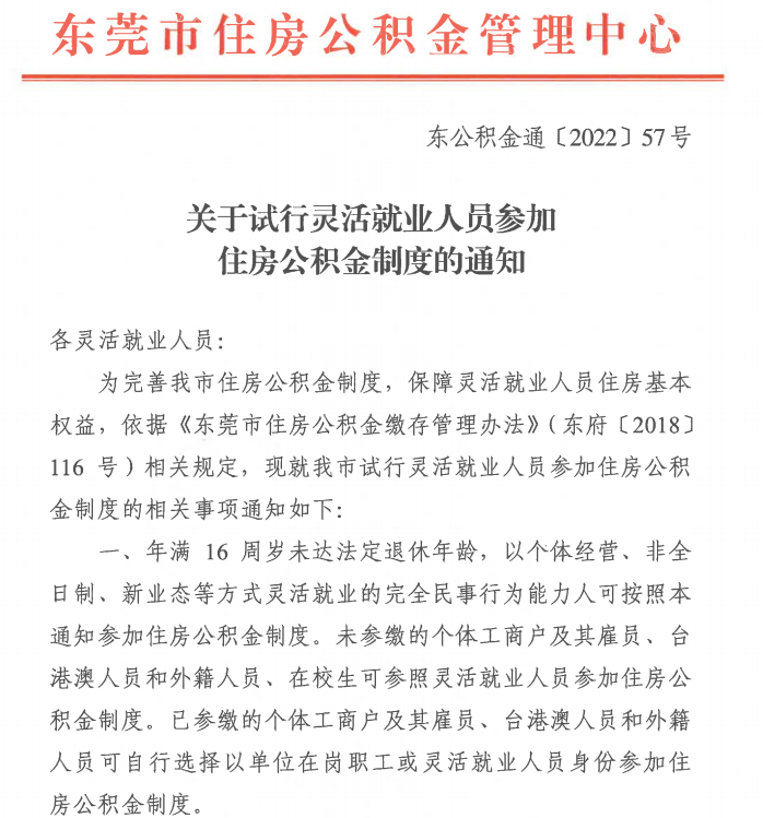 10月28日,东莞市住房公积金管理中心发布通知,即日起,东莞市灵活就业人员可自愿参加住房公积金制度,并与单位在岗职工享受住房公积金同等权益。