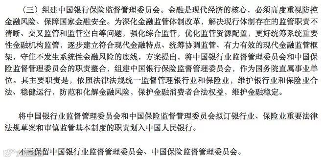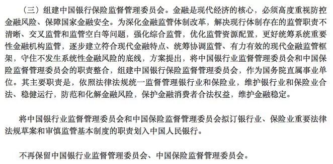 “(三)组建中国银行保险监督管理委员会。金融是现代经济的核心,必须高度重视防控金融风险、保障国家金融安全。