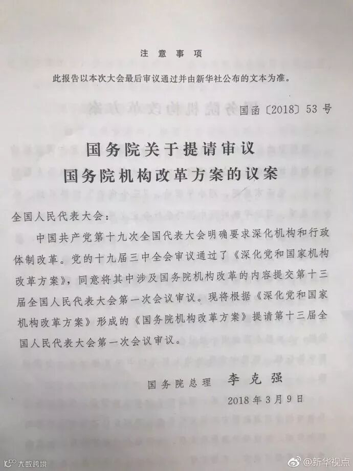 3月13日,国务院机构改革方案提请十三届全国人大一次会议审议。