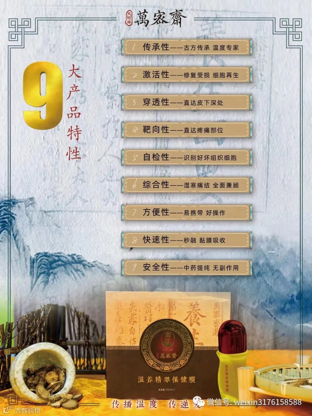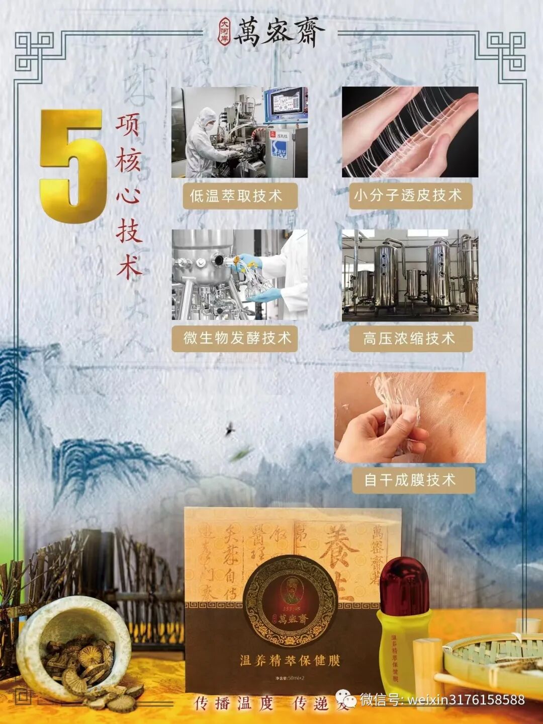 针对健康问题和疾病年轻化的发展趋势,经科研团队不断潜心研究,依托中医国粹百年经典古方传承,结合现代生物技术,融合众多珍稀药材,耗时3年,研发出了一款适合各年龄段患者及亚健康人群使用的产品——万密斋温养精萃保健膜,为广大亚健康患者提供一支“行走的医药箱”。