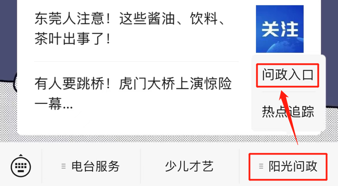 点击下方卡片关注“东莞电台”微信公众号,再点击底部菜单栏“阳光问政”——“问政入口”就可以啦!
