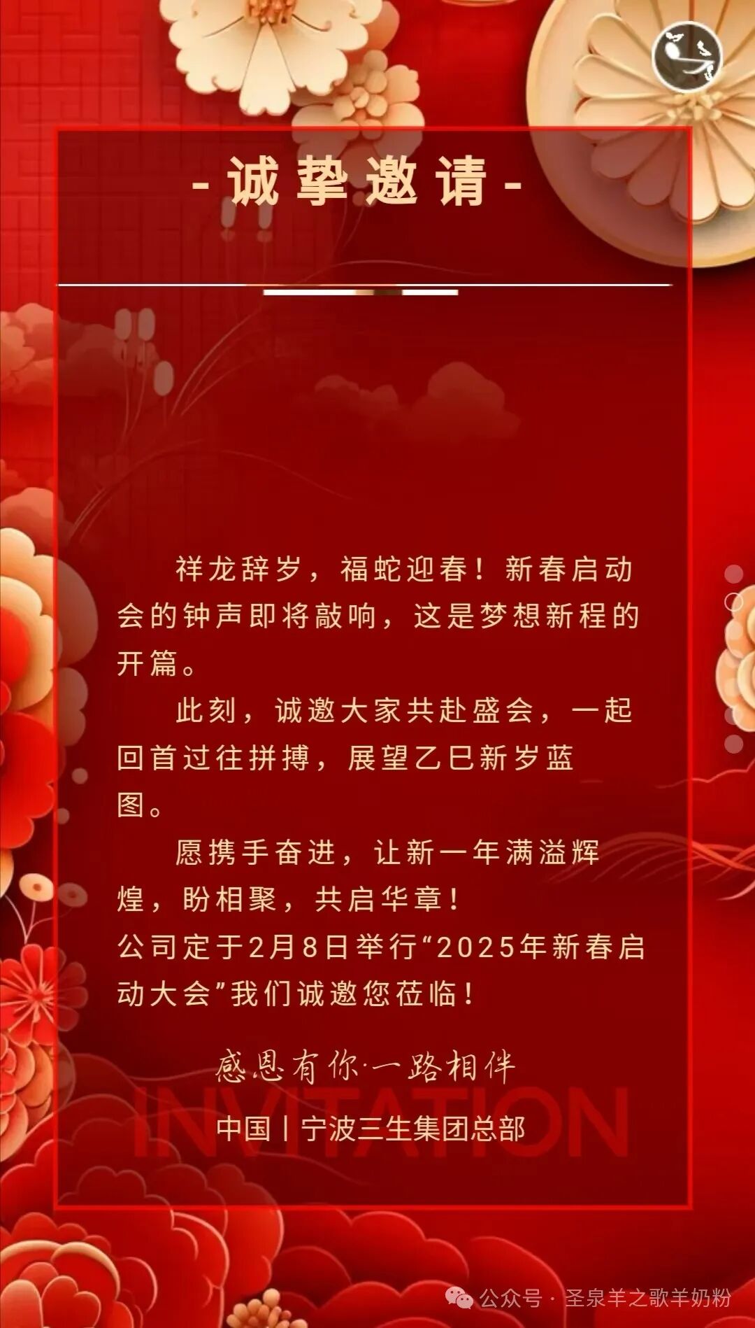 抢占先机,共赢未来!阳明系统羊之歌羊奶粉2025年蛇来运转★羊帆起航新春启动会,2月8日-9日浙江宁波盛大开启!行业大咖齐聚,干货分享不断,带您洞悉羊奶粉市场新趋势,抢占百亿市场先机!