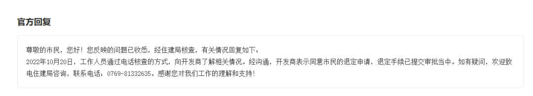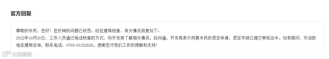 2022年10月20日,工作人员通过电话核查的方式,向开发商了解相关情况。经沟通,开发商表示同意市民的退定申请,退定手续已提交审批。