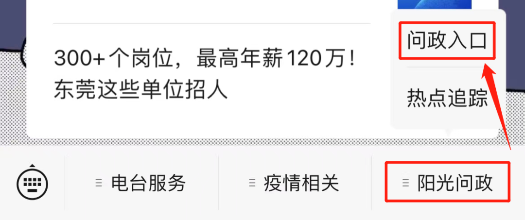 答:方法很简单!点击下方卡片关注“东莞电台”微信公众号,再点击底部菜单栏“阳光问政”——“问政入口”就可以啦!快去试试吧!