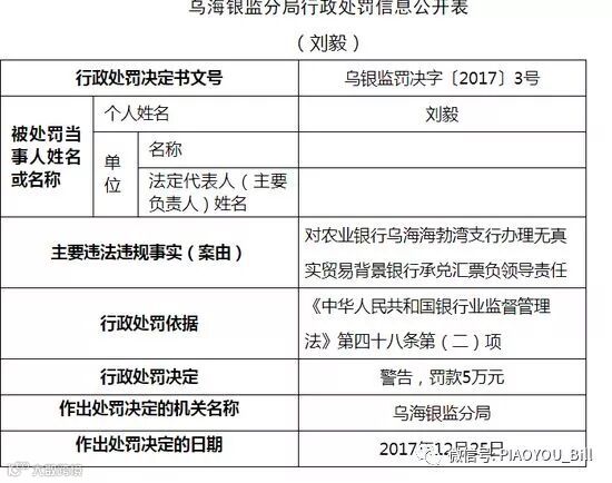 乌海银监分局分别依据《中华人民共和国银行业监督管理法》第四十六条第(五)项、《中华人民共和国银行业监督管理法》第四十八条第(二)项,对中国农业银行股份有限公司乌海海勃湾支行罚款20万元,对刘毅警告,并罚款5万元。作出作出处罚决定的日期均为2017年12月25日。