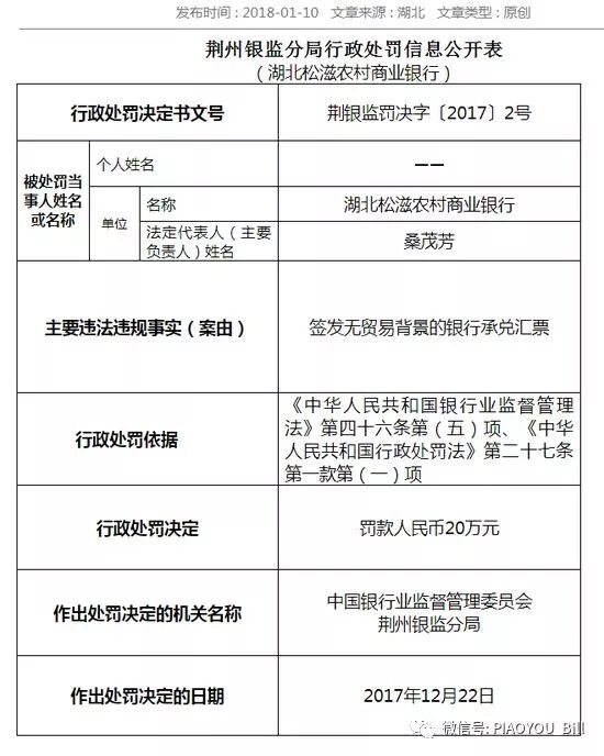 经查,湖北松滋农村商业银行签发无贸易背景的银行承兑汇票,违反了《中华人民共和国银行业监督管理法》第四十六条第(五)项、《中华人民共和国行政处罚法》第二十七条第一款第(一)项,被银监分局罚款20万元。