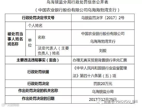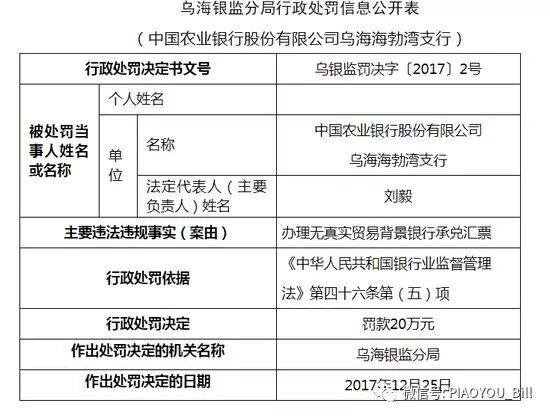 1月18日消息,中国银监会网站公布了乌海银监分局行政处罚信息公开表,对中国农业银行(4.360, -0.11, -2.46%)股份有限公司乌海海勃湾支行办理无真实贸易背景银行承兑汇票罚款20万元。相关负责人被处以警告,并罚款5万元。