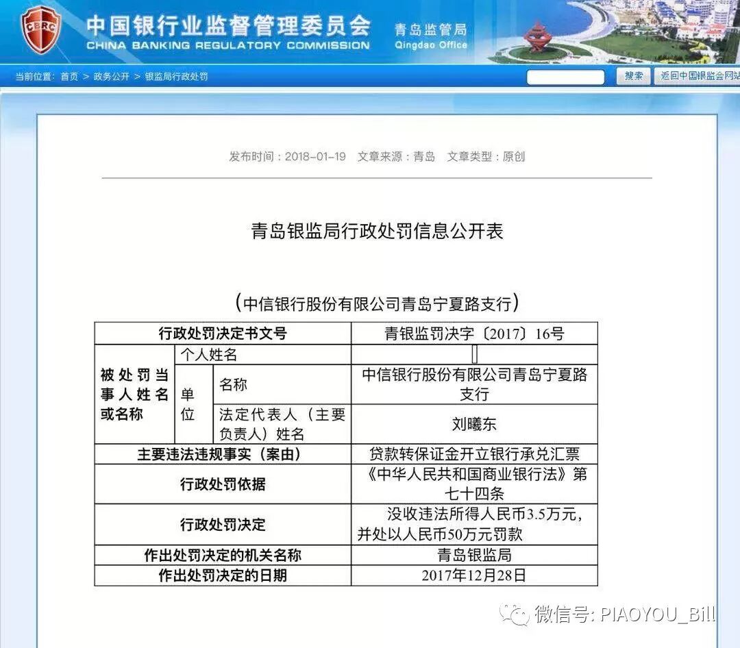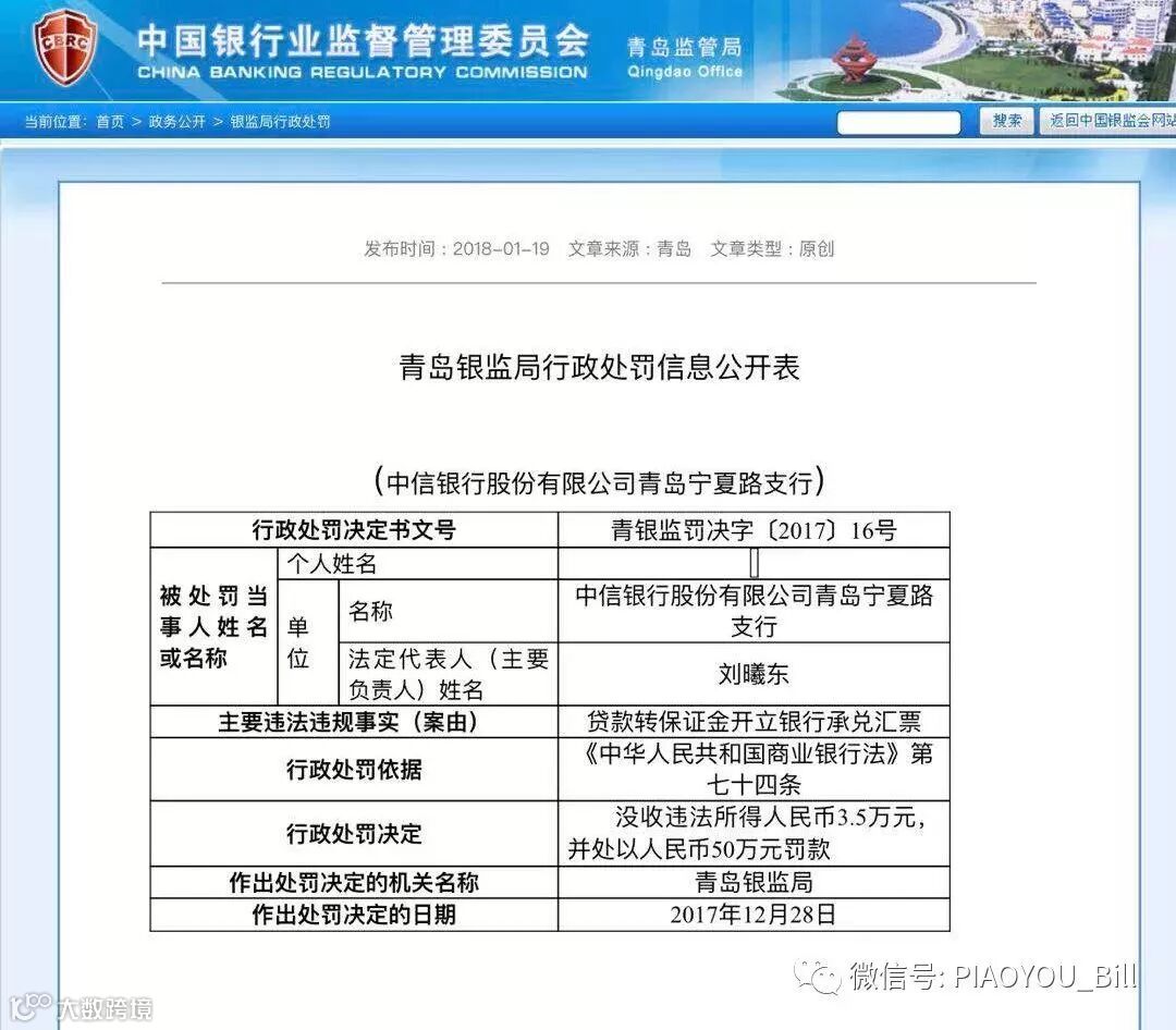 2018年1月19日,中国银监会青岛银监局发布青银监罚决字〔2017〕16号行政处罚决定书,中信银行股份有限公司青岛宁夏路支行因违规贷款转保证金开立银行承兑汇票被处罚。
