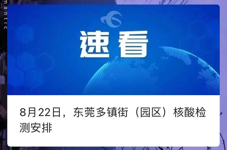 截至发稿,已发布核酸检测工作相关通知的镇街(园区)有:中堂、石碣、寮步、莞城、大岭山、万江、东城、石排、常平、松山湖、南城、沙田、凤岗、道滘、樟木头、桥头、横沥、企石、东坑、黄江、厚街、清溪、大朗、塘厦、望牛墩、茶山、谢岗、石龙、虎门(其余镇街安排,小编会及时跟进与更新,请密切留意。)