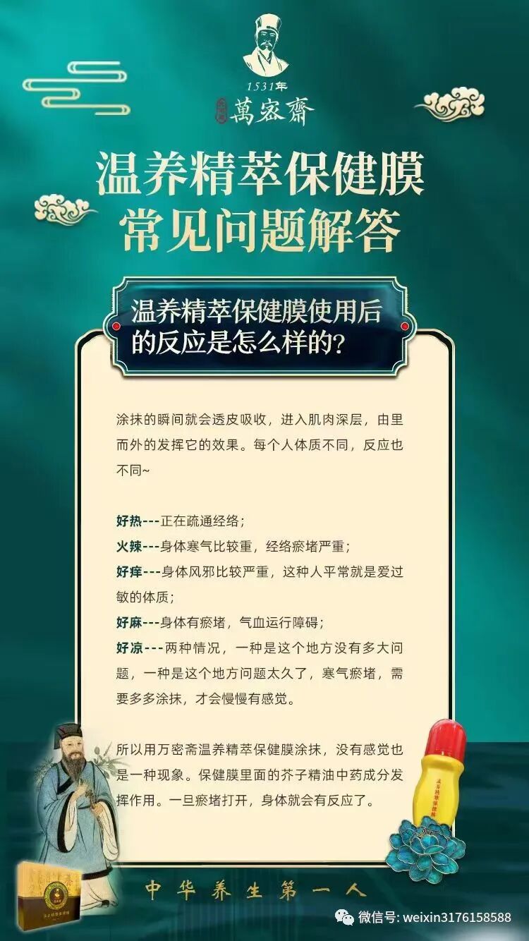 所以用万密斋温养精萃膜涂抹,没有感觉也是一种现象。保健膜里的芥子精油等中药成分发挥作用,一旦瘀堵打开,身体就会有反应了。