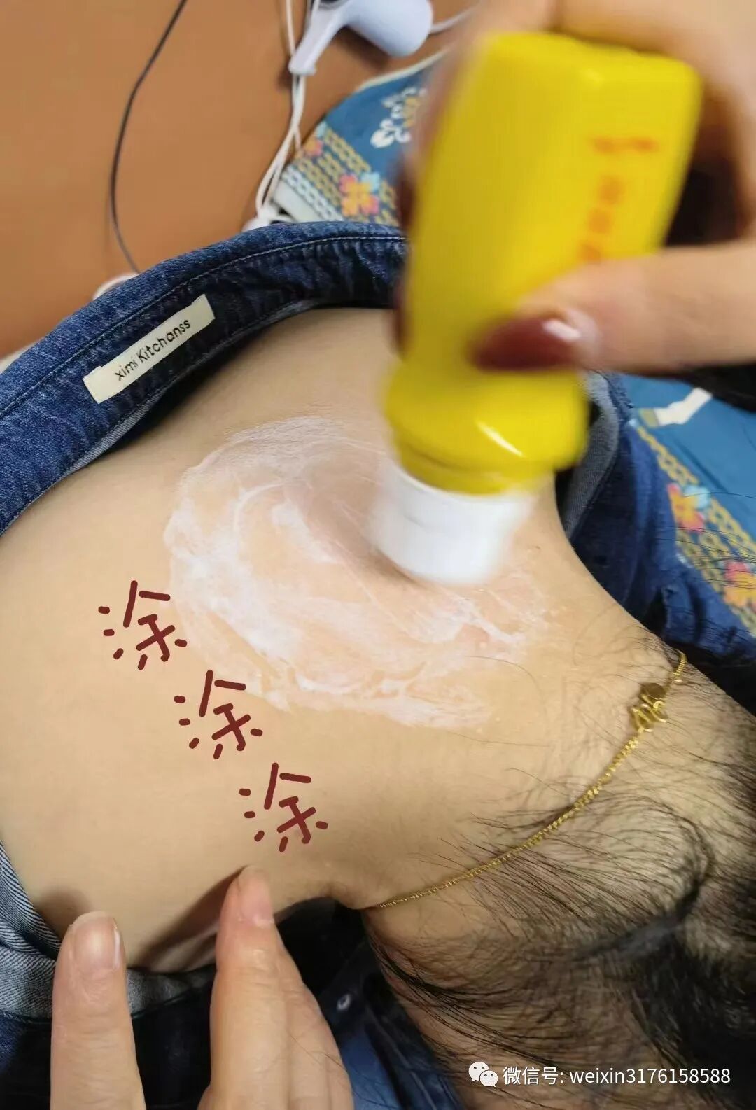 寒湿在全身比如说大家也看到了胸部的一些内容,比如说长增生,长各种囊肿等等。举个简单的例子:感冒了受凉了,如果顾客头发剃了的,头疗效果非常好,主要做背,做背效果特别明显。你把背给它涂上,它调感冒这个效果非常明显。你给他连续涂,膜干了之后撕掉再涂,再干了撕掉再涂,涂三遍。一般连续做三天,基本感冒都好了。