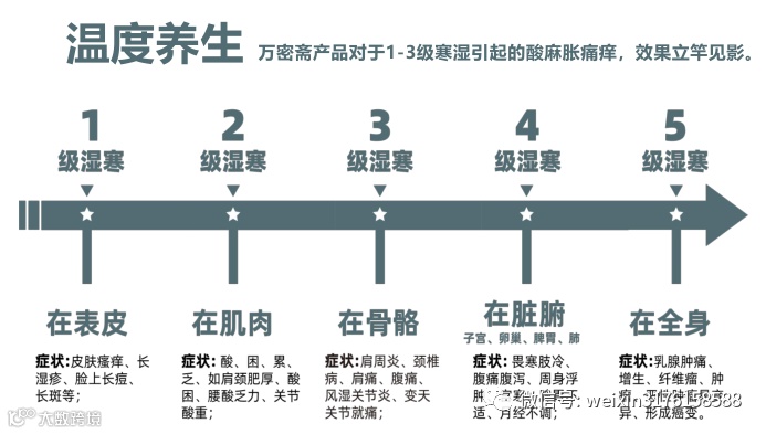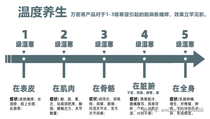 万密斋温养精萃保健膜产品主要定位痛症,对于1-3级寒湿引起的酸麻胀痛痒,效果立竿见影,我们一起为了解寒湿,为什么这一章讲的是寒湿,因为寒湿所导致的问题,最直接的问题就是痛……我们把寒湿分为5级