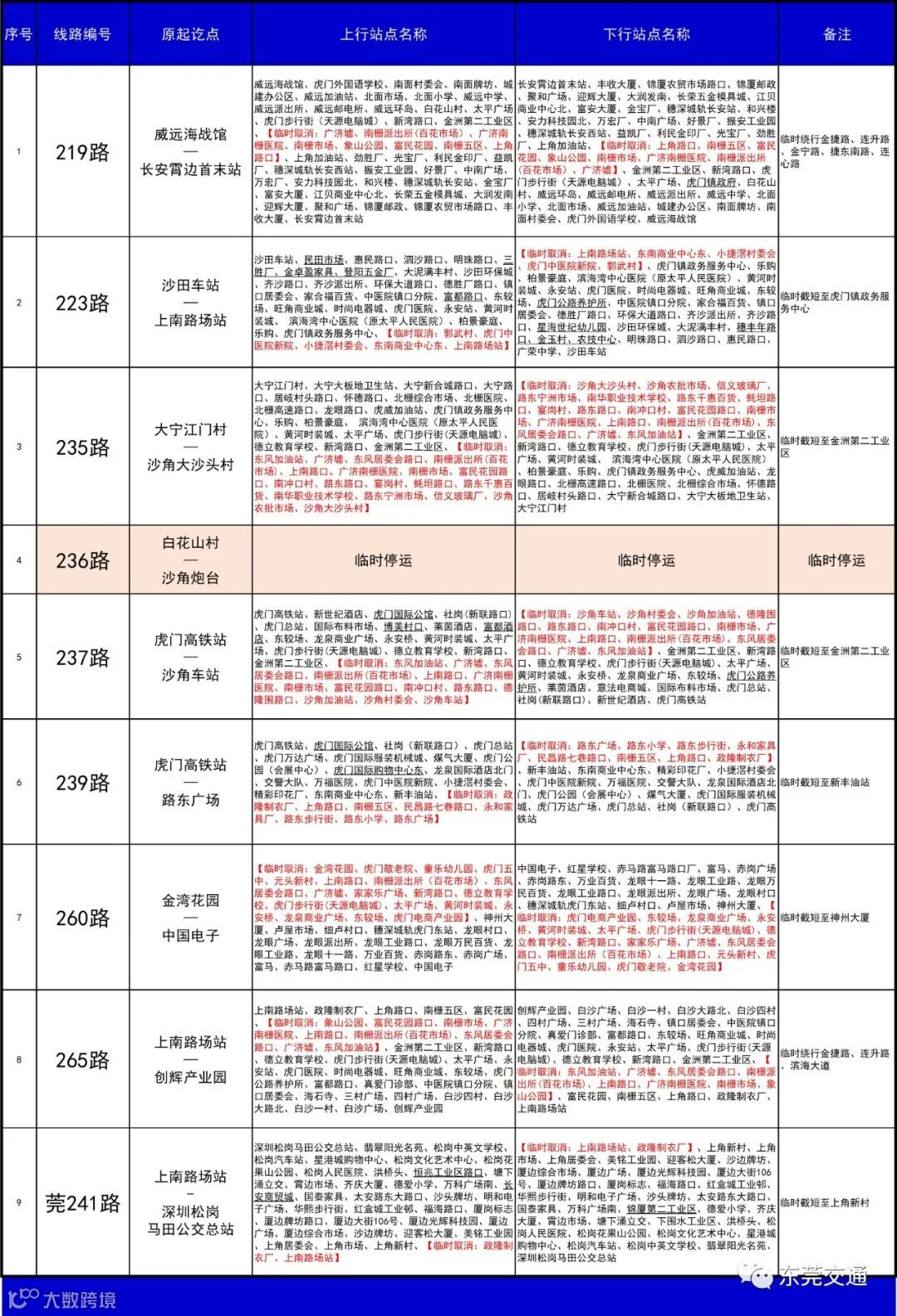 219路、223路、235路、236路、237路、239路、260路、265路与莞241路等公交线路实施临时调整,其中236路临时停运。