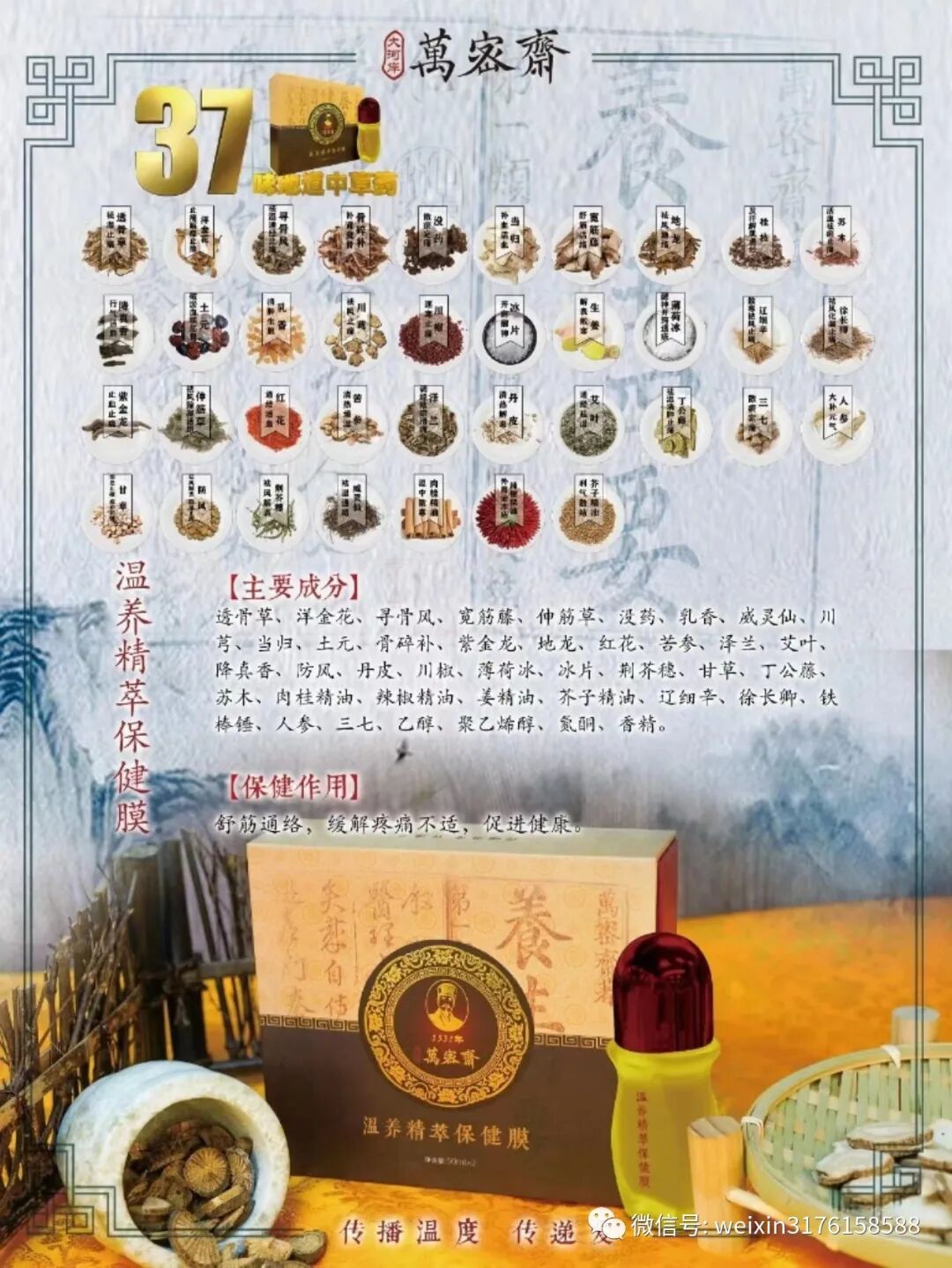 万密斋温养精萃保健膜,传承万氏家族经典养生古方,精选37味道地中草药,经秘法熬制发酵和现代低温萃取等加工方法,运用中药归经原则,作用于肌表,渗透力强,见效快,高效持久,排湿寒祛酸痛效果显著,有效缓解人体亚健康问题。