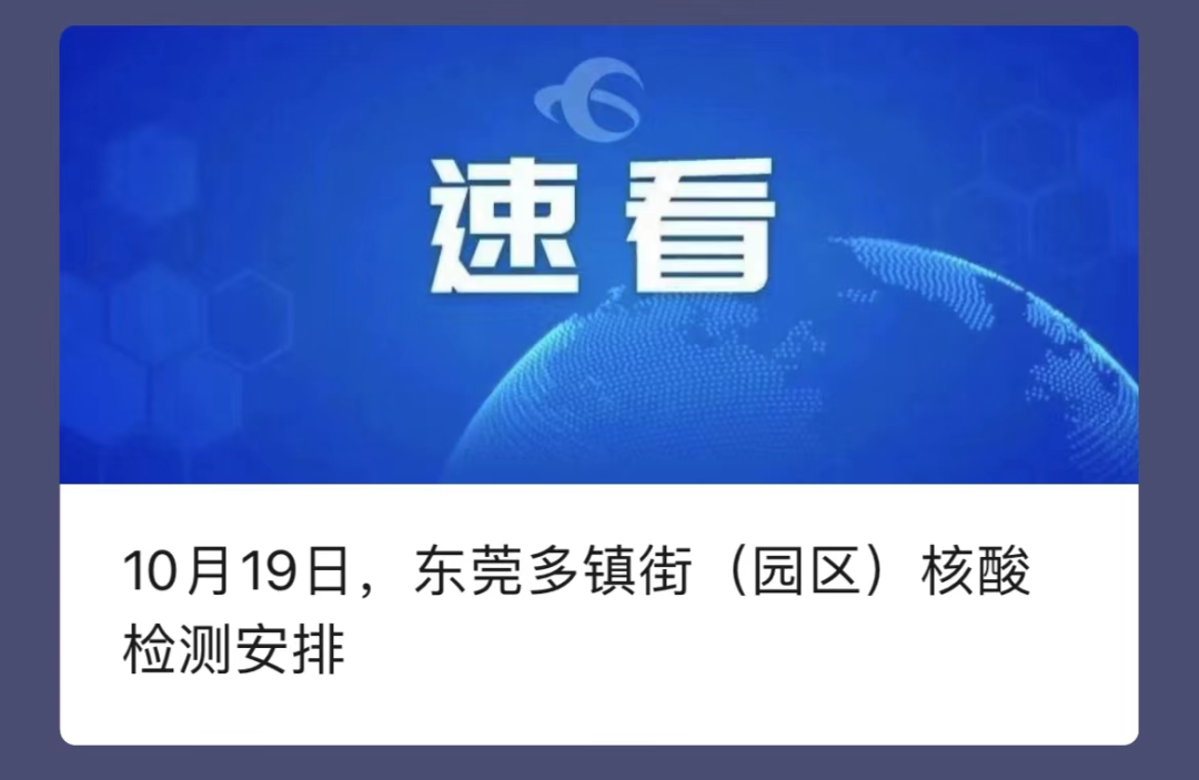 截至发稿,东莞这些镇街已发布核酸检测相关通知:沙田、麻涌、长安、樟木头、茶山、万江、厚街、洪梅、清溪、凤岗、高埗、谢岗、大岭山、桥头、石排、东坑、南城、东城、石龙、虎门、塘厦、黄江、望牛墩、石碣、大朗…(各镇街最新安排,小编会及时跟进与更新,请密切留意。)