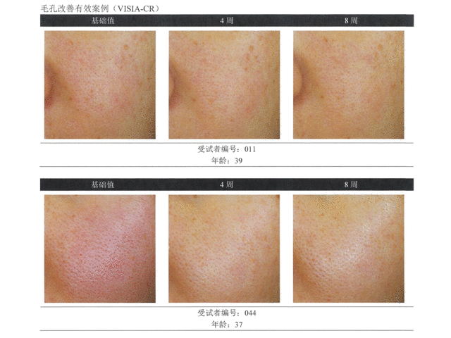 注:数据及使用前后对比,来自上海复硕正态信息科技有限公司,筛选42名年龄为25-40周岁的中国女性,脸部伴有轻微细纹并有毛孔粗大、缺乏弹性等问题。连续使用产品8周,分别在1周、2周、4周及8周后评估结果。