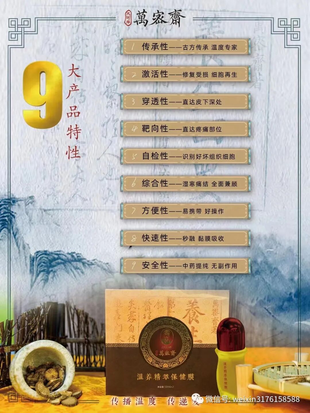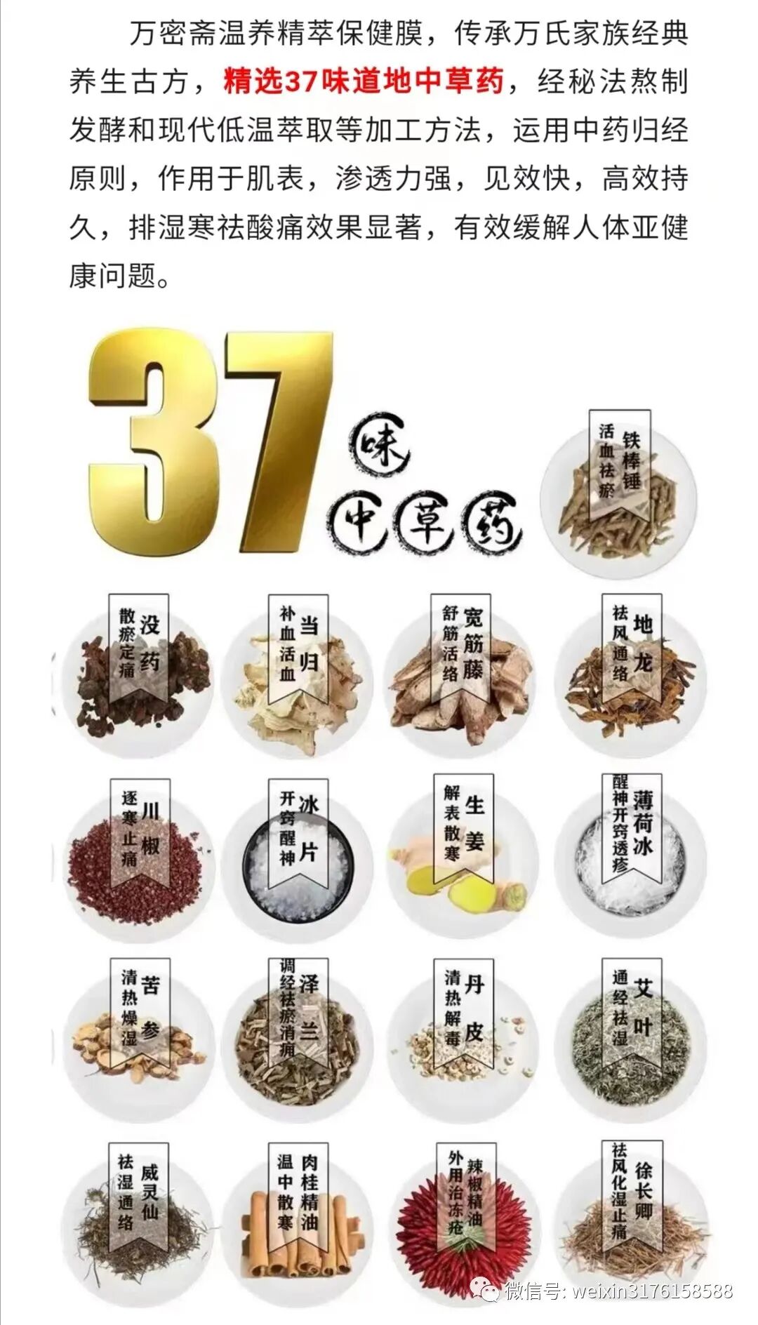 关节炎?试试万密斋的明星产品 —— 温养精萃保健膜,传承了万氏家族的经典养生古方,精心选取37味地道的中草药,经过秘法熬制发酵和现代低温萃取等一系列加工方式,遵循中药归经的原则,作用于肌表,不但渗透力强,见效快,持久性强,并且排湿寒祛酸痛的效果明显,能有效缓解人体亚健康的问题。