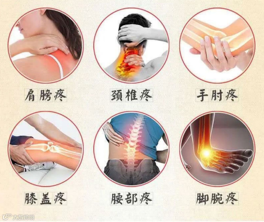 骨关节炎,包括有膝骨关节炎、手骨关节炎、髋关节炎、颈椎病、腰椎病以及肩周关节、足关节、胸锁关节骨关节炎等;