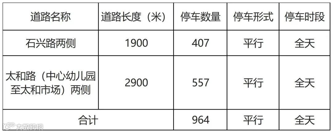 通过对辖区内石兴路、太和路两个路段区域范围的摸查、初勘,调研分析,根据《城市道路路内停车泊位设置规范(GA/T 850-2021)》规范要求(详见下表),符合泊位设置规范。根据停车需求测算,上述路段两侧计划建设路内停车泊位约964个以满足市民停车需求。
