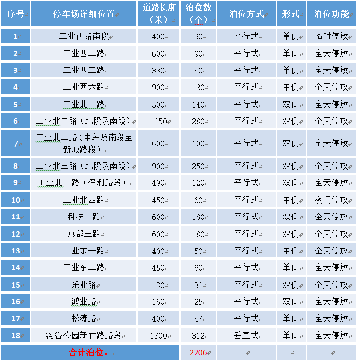 其中,工业北一路、工业北二路(北段及南段)、工业北二路(中段及南段至新城路段)、工业北三路(北段及南段)、工业北三路(保利路段)、科技四路、总部三路、乐业路、鸿业路现状均符合道路双侧泊位设置规范,经测算,该9条路段计划建设双侧路内停车泊位合计约1397个泊位。