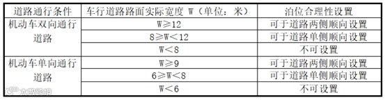 ▲上表为规划中根据道路宽度考虑泊位设置的合理性要求表