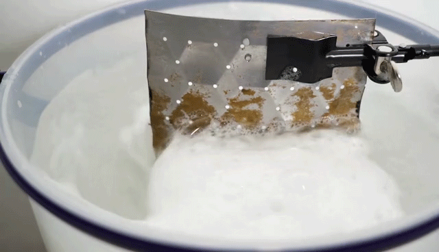 可以看出年深日久的污渍已经凝固在铁片上,很难清理。