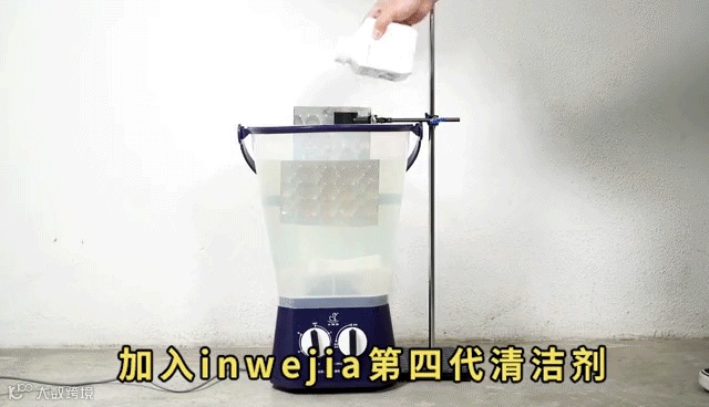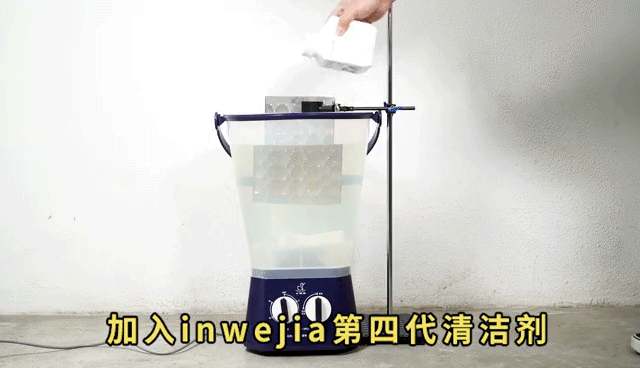 摆上小型洗衣机,倒入白倍极清洁剂,洗涤1小时。