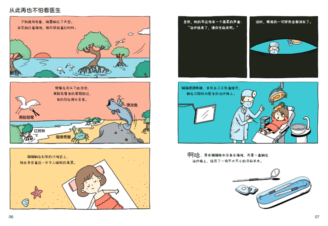 先是描述一处自然风光,小女孩娟娟正惬意地躺在沙滩上吹海风,但伴随着一声:“治疗结束了,请你坐起来吧。”娟娟一睁眼却发现自己躺在医院的治疗椅上。