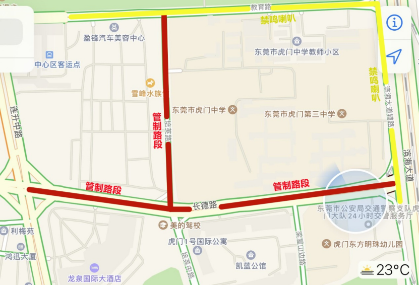 1、长德路交警大队红绿灯至龙泉国际酒店红绿灯路段、培英路虎门中学路段实行双向封路、禁止车辆进入、禁鸣喇叭、禁止停车;
