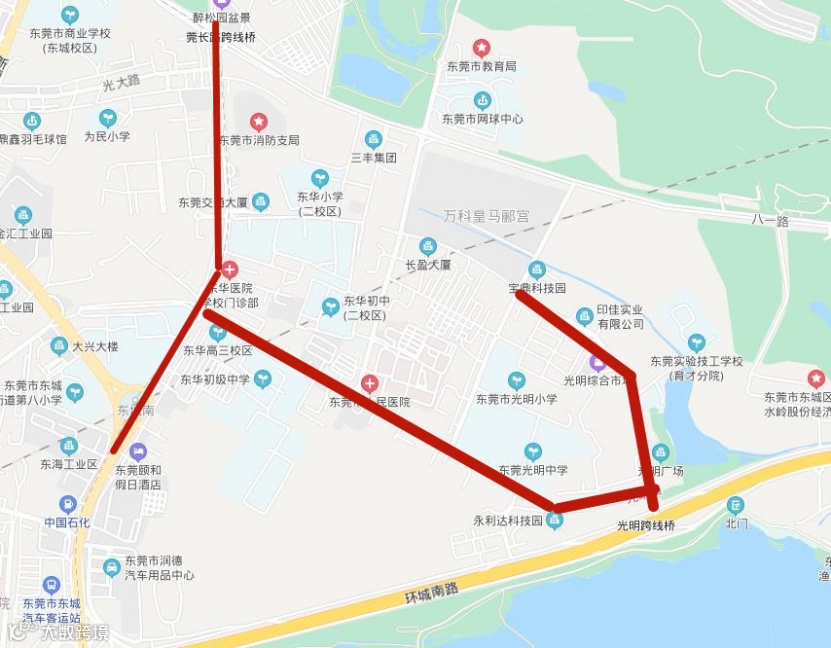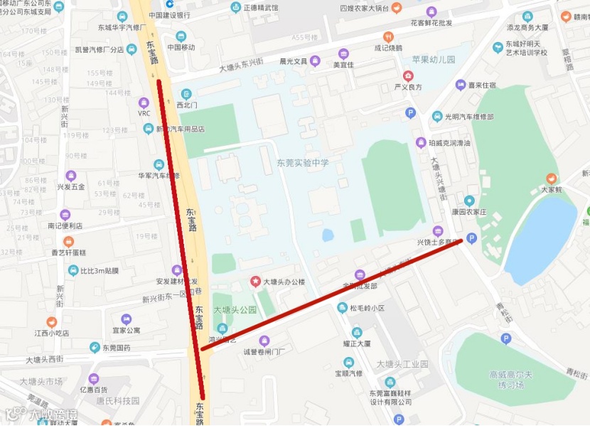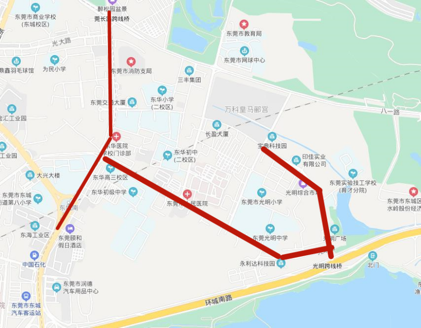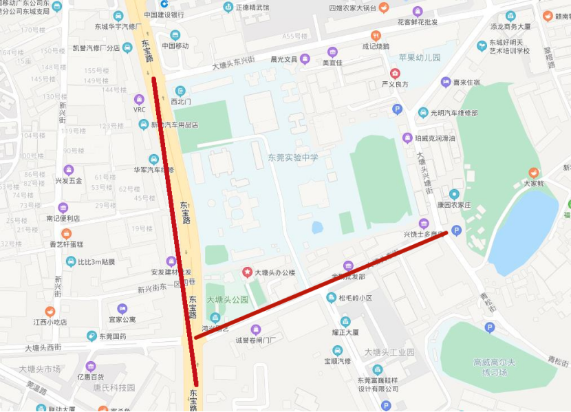 景顺路、伟业路东莞一中路段、莞长路东城段、大塘头东街、东宝路实验中学路段、光明路。