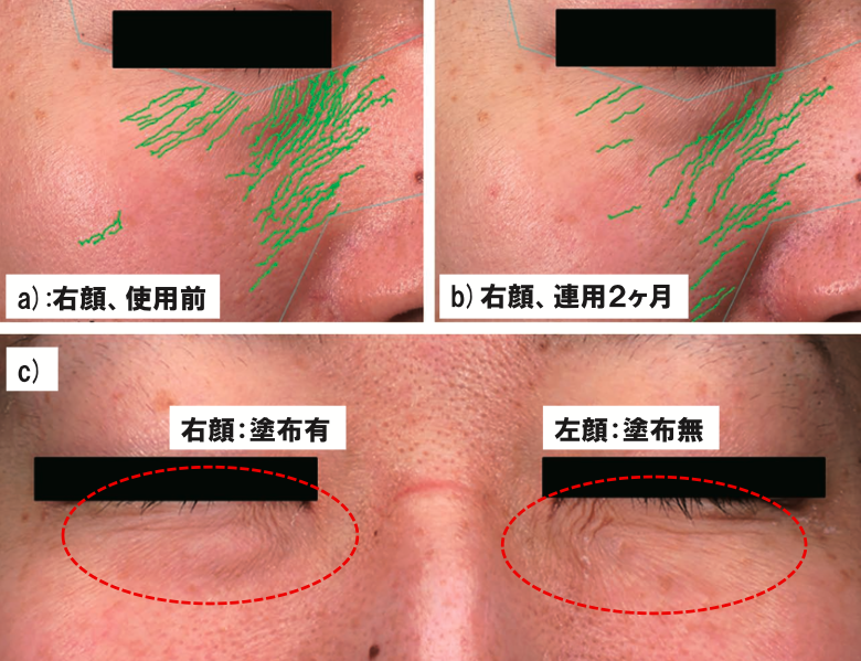 注:接受试验者为8名30-50岁女性和2名30-40岁男性,试验于脸部皮肤。使用VISIA检测仪(Canfield Scientific)标记纹路形状和位置。效果仅限参加试验者。