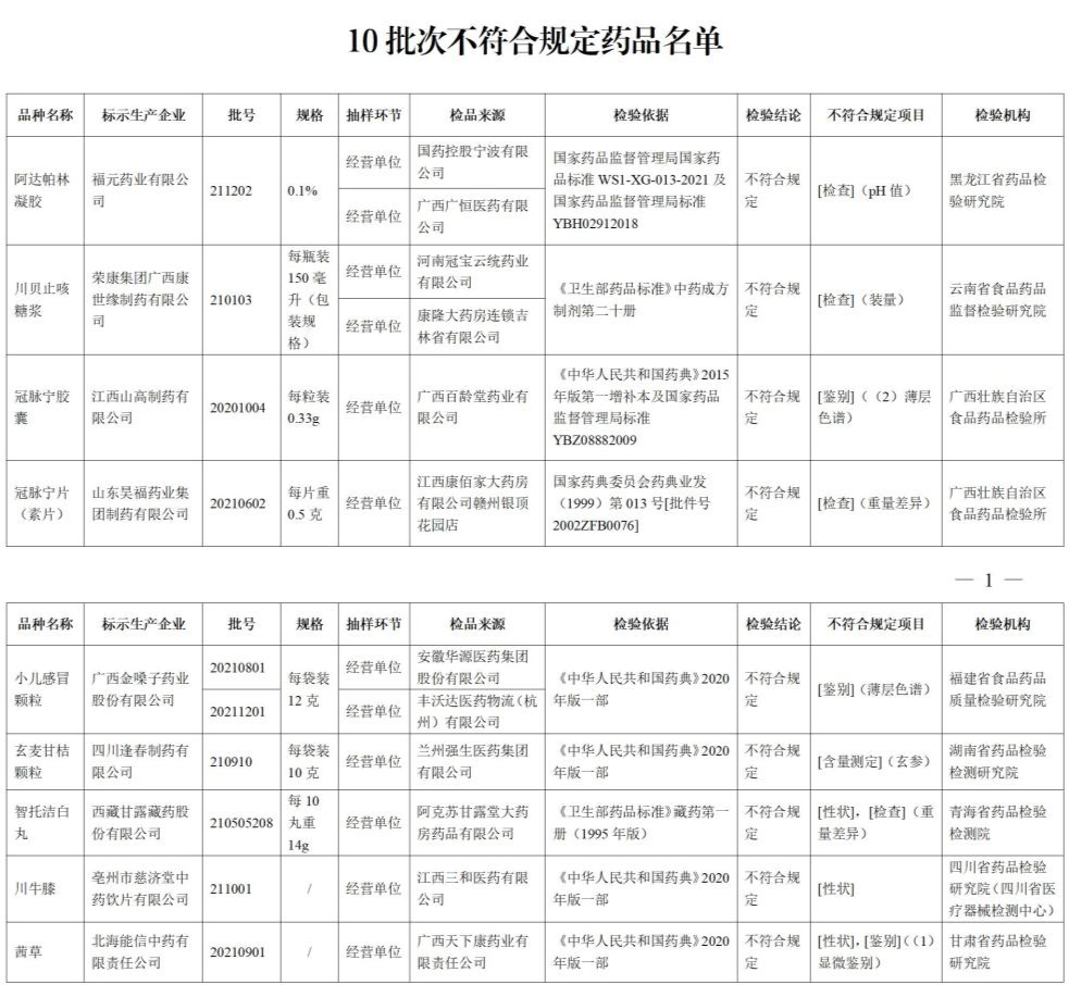 经广西壮族自治区食品药品检验所检验,标示为江西山高制药有限公司生产的1批次冠脉宁胶囊不符合规定,不符合规定项目为鉴别;标示为山东昊福药业集团制药有限公司生产的1批次冠脉宁片(素片)不符合规定,不符合规定项目为重量差异。