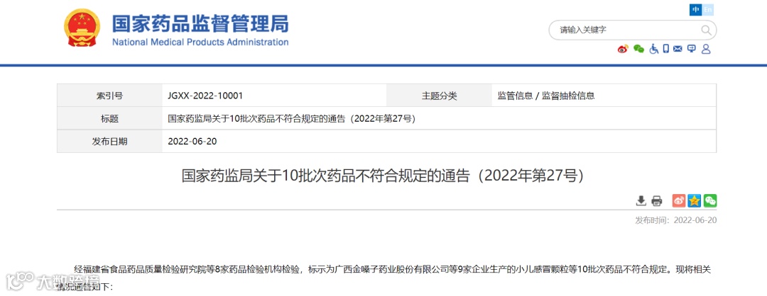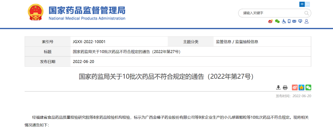 经福建省食品药品质量检验研究院检验,标示为广西金嗓子药业股份有限公司生产的2批次小儿感冒颗粒不符合规定,不符合规定项目为鉴别。