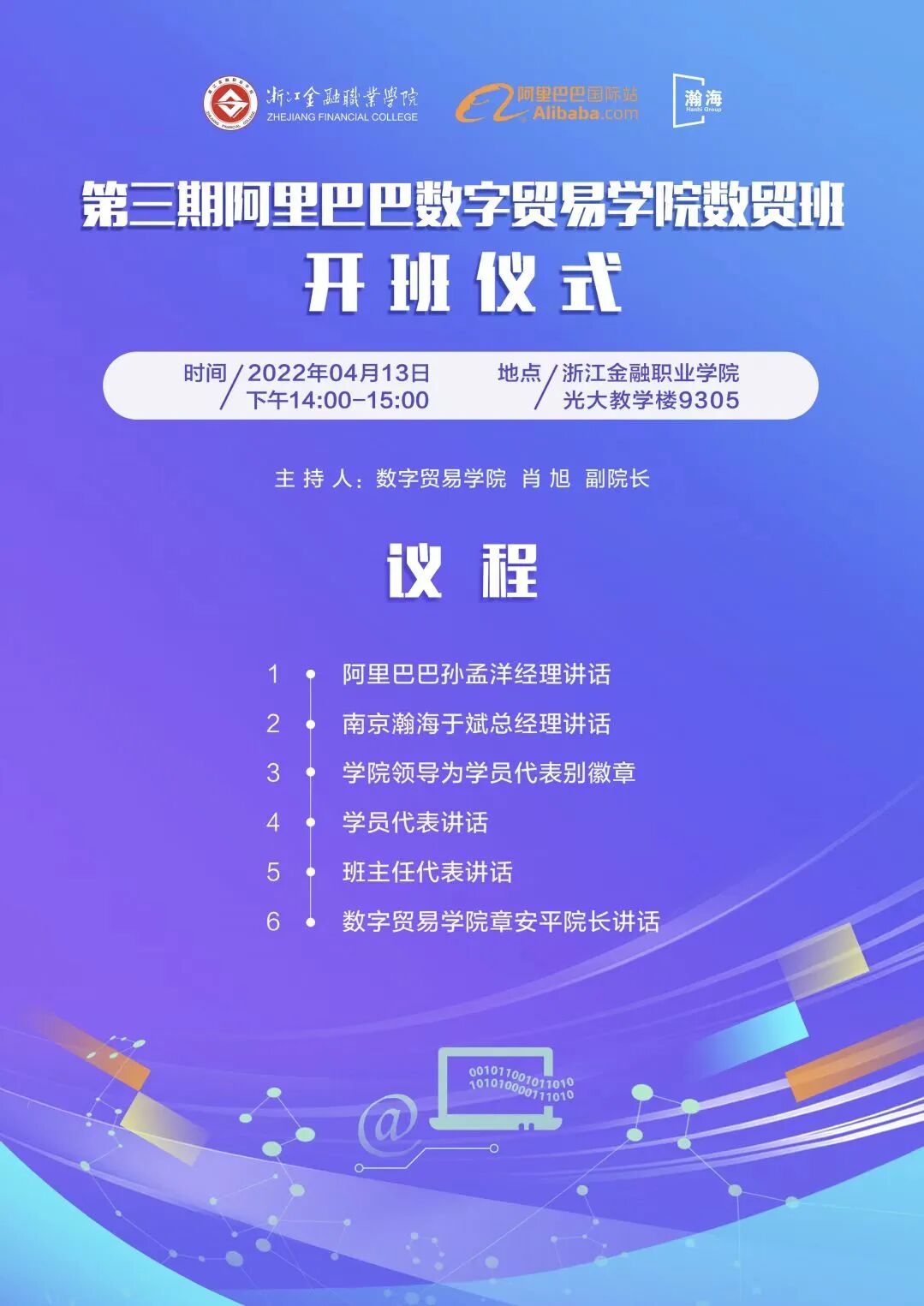 2022年4月13日,瀚海 Group - 浙江金融职业学院第三期数字贸易班开班仪式于光大教学楼9305拉开帷幕,为配合政府疫情管控政策,本次会议采取线上+线下的方式进行。恰逢在高校对外开放办学和推进校企共建之际,瀚海与浙江金融职业学院三期数贸班的成功开启意味着“校企合作”又前进了一大步。